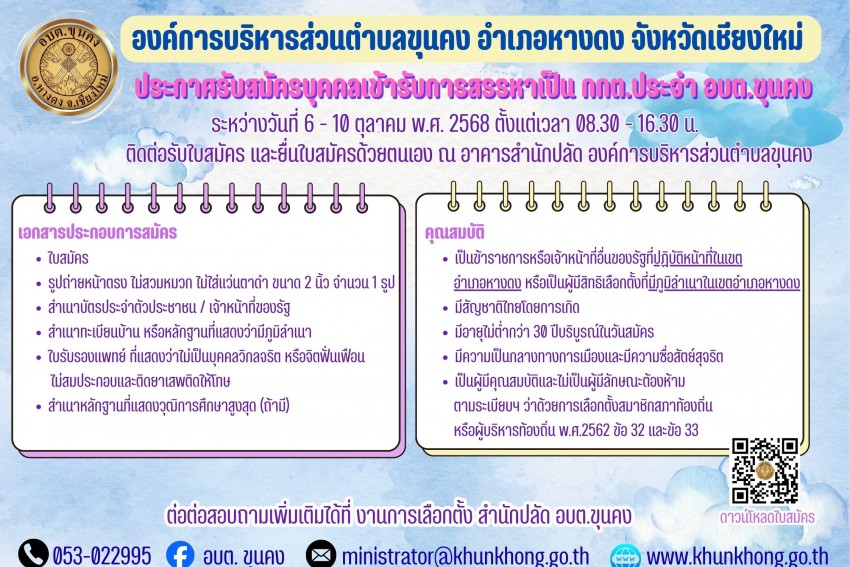 - ประกาศ เรื่อง ประกวดราคาจ้างโครงการจ้างเหมาบริการเก็บ ขน และกำจัดขยะสิ่งปฏิกูลมูลฝอยององค์การบริหารส่วนตำบลขุนคง ประจำปีงบประมาณ พ.ศ. 2569(3 ตุลาคม 2568)