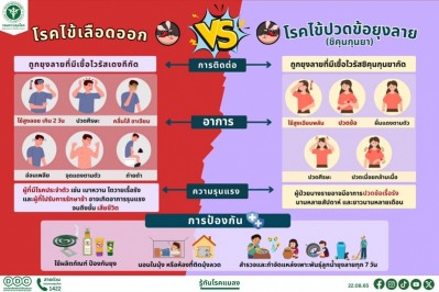"ไข้เลือดออก VS โรคไข้ปวดข้อยุงลาย(ชิคุณกุนยา)" อาการแตกต่างกัน แต่สามารถป่วยรุนแรงได้เหมือนกัน ไข้เลือดออก : อาการรุนแรงถึงชีวิต ไข้ปวดข้อยุงลาย : ไม่เสียชีวิต แต่สร้างความทรมาน ปวดข้อ