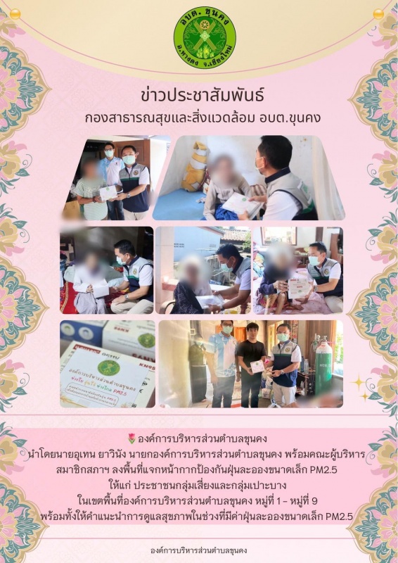 นำโดยนายอุเทน ยาวินัง นายกองค์การบริหารส่วนตำบลขุนคง พร้อมคณะผู้บริหาร สมาชิกสภาฯ ลงพื้นที่แจกหน้ากากป้องกันฝุ่นละอองขนาดเล็ก PM2.5 ให้แก่ ประชาชนกลุ่มเสี่ยงและกลุ่มเปาะบางในเขตพื้นที่องค์การบริหารส่วนตำบลขุนคง หมู่ที่ 1 - หมู่ที่ 9 พร้อมทั้งให้คำแนะนำการดูแลสุขภาพในช่วงที่มีค่าฝุ่นละอองขนาดเล็ก PM2.5