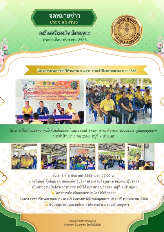 วันเสาร์ ที่ 6 กันยายน 2568 เวลา 09.00 น. นายพิทักษ์ ตุ้มอินมร นายกองค์การบริหารส่วนตำบลขุนคง พร้อมคณะผู้บริหาร เป็นประธานเปิดโครงการพระราชดำริด้านสาธารณสุขของ หมู่ที่ 9 บ้านแพะ