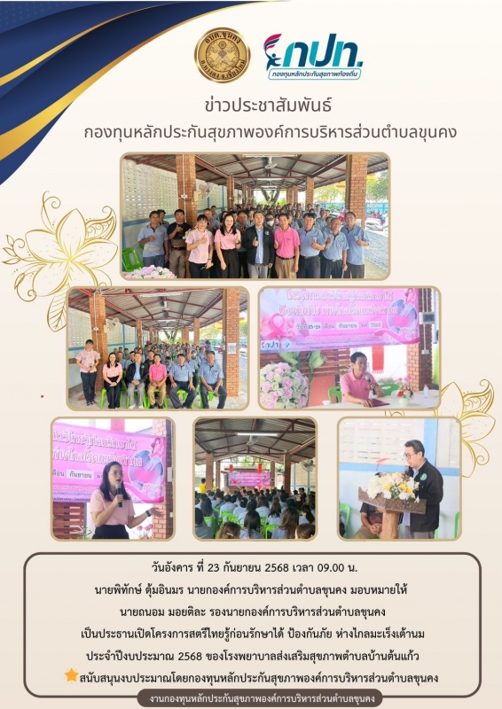 วันอังคาร ที่ 23 กันยายน 2568 เวลา 09.00 น. นายพิทักษ์ ตุ้มอินมร นายกองค์การบริหารส่วนตำบลขุนคง มอบหมายให้นายถนอม มอยติละ รองนายกองค์การบริหารส่วนตำบลขุนคง เป็นประธานเปิดโครงการสตรีไทยรู้ก่อนรักษา