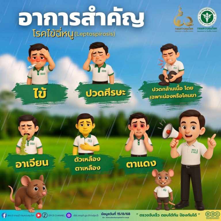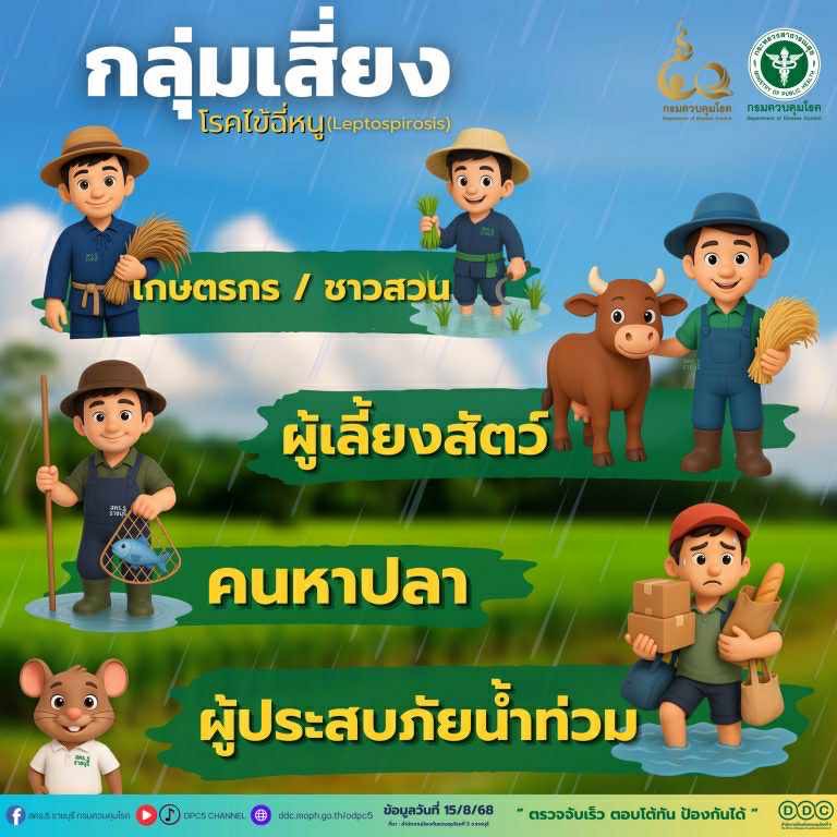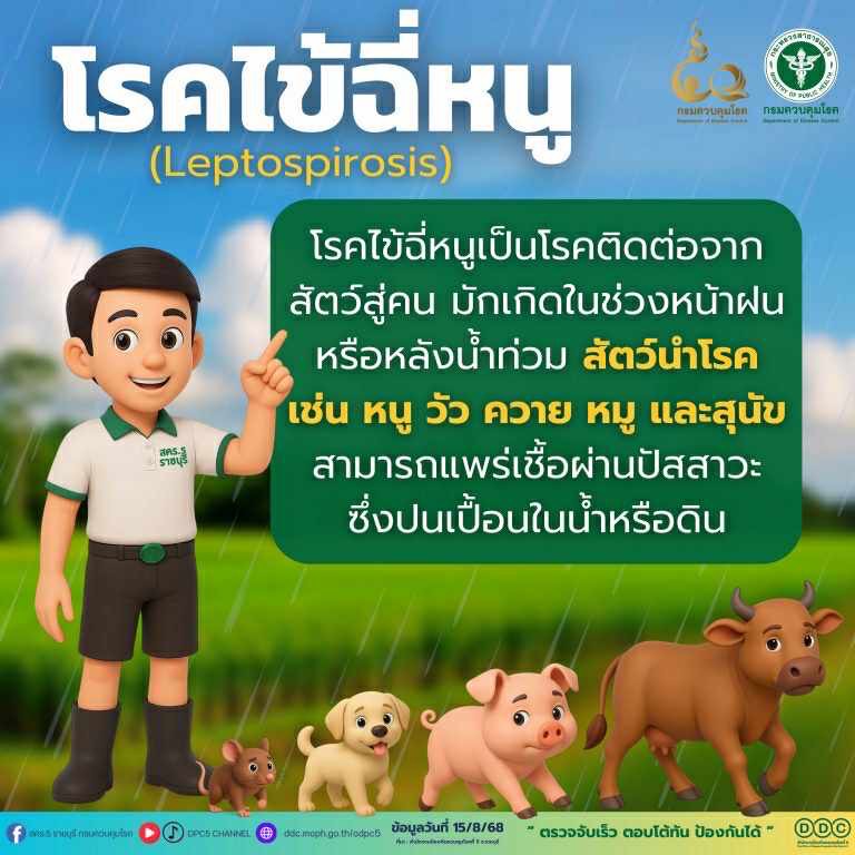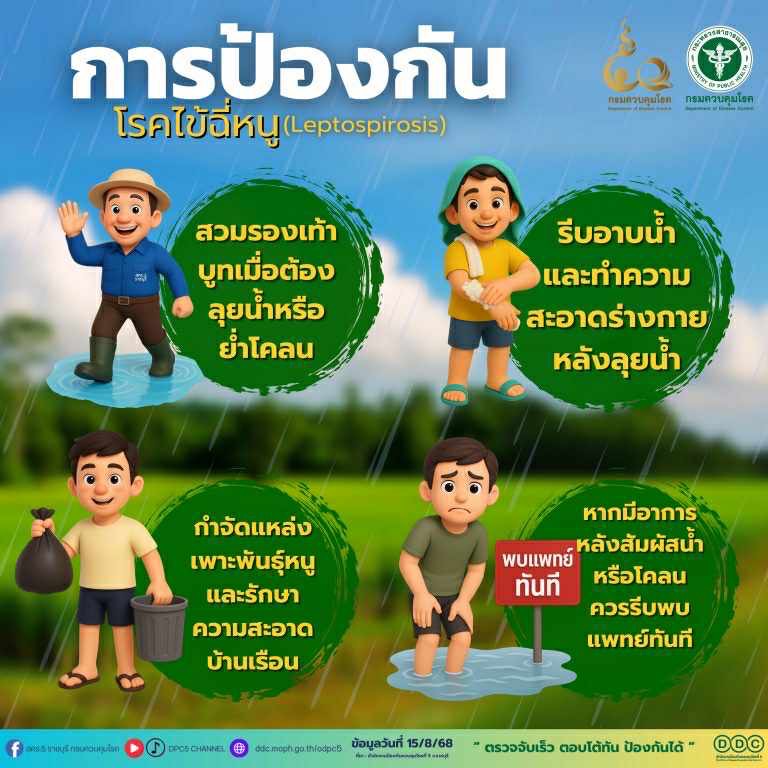 หน้าฝน ระวัง! โรคไข้ฉี่หนู โรคติดต่อจากสัตว์สู่คน เกิดจากปัสสาวะของหนู วัว ควาย หมู หรือสุนัข ที่ปนเปื้อนในน้ำหรือดิน พบมากหลังฝนตก น้ำท่วม หรือทำงานในพื้นที่ชื้นแฉะ