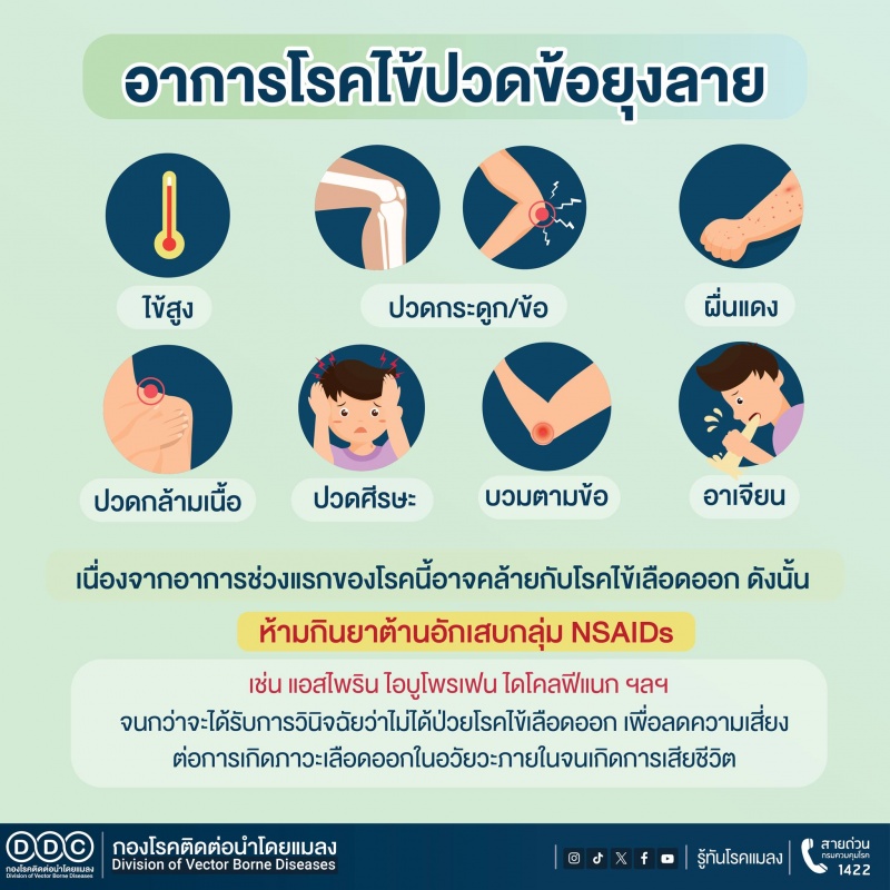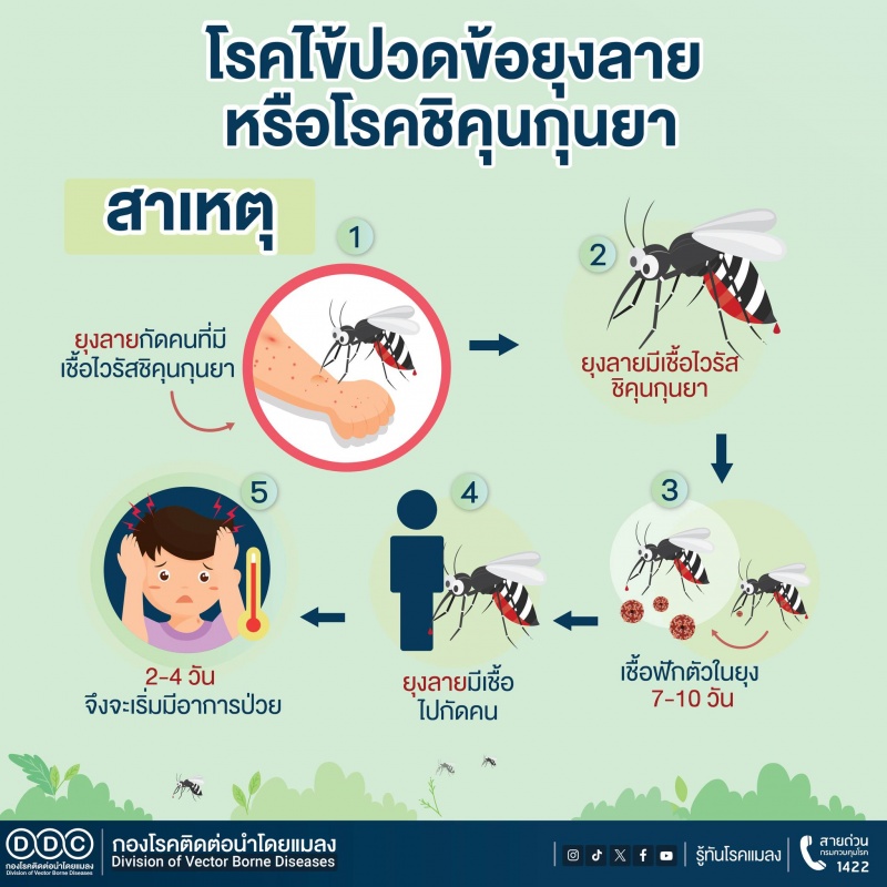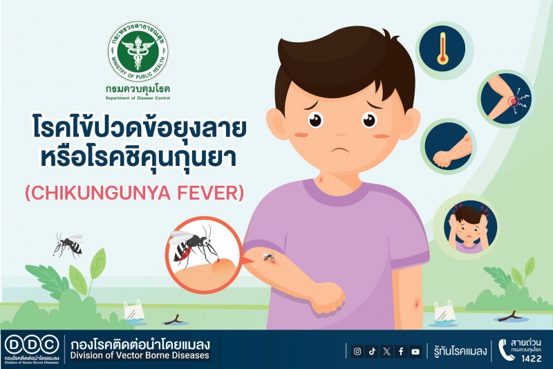 "โรคไข้ปวดข้อยุงลาย (ชิคุนกุนยา) โรคร้ายที่ยุงลายเป็นพาหะ" โรคไข้ปวดข้อยุงลาย เกิดจากการติดเชื้อไวรัสชิคุนกุนยาโดยมียุงลายเป็นพาหะนำโรค