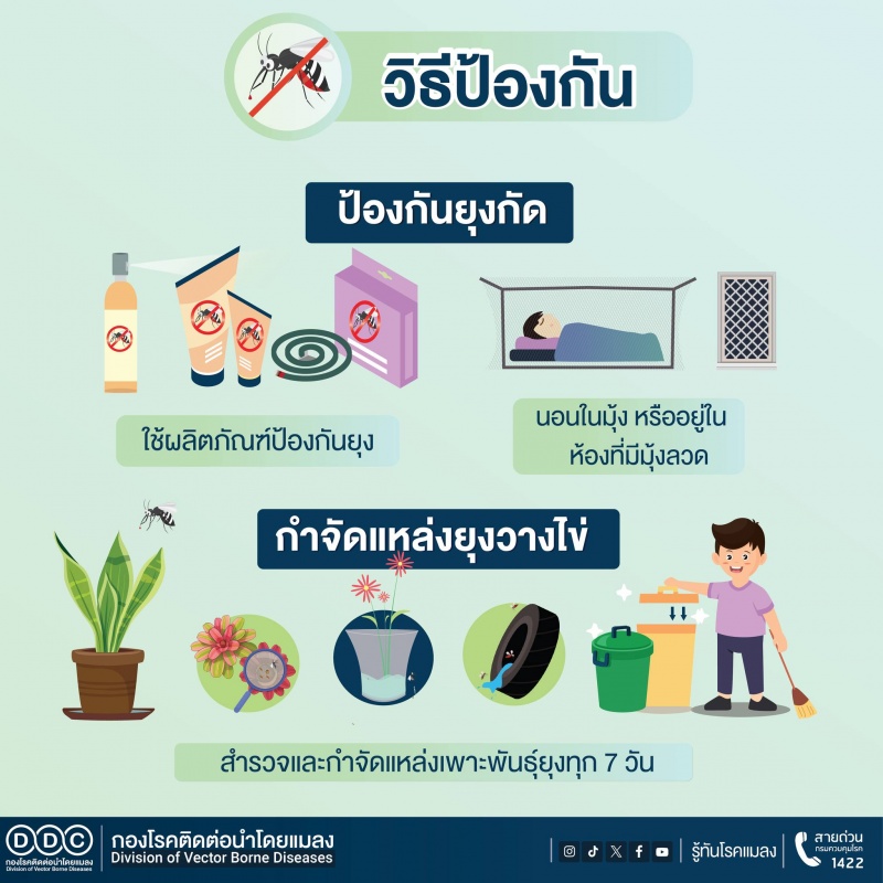ป้องกันตนเองไม่ให้ถูกยุงกัด เช่น ทายากันยุง สวมเสื้อผ้าแขนยาวขายาว