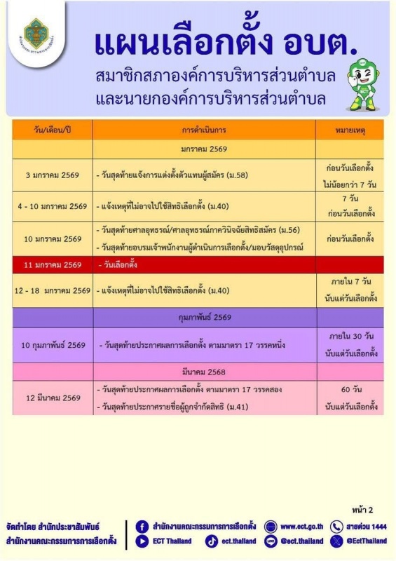 ประชาสัมพันธ์ แผนการเลือกตั้งสมาชิกสภาองค์การบริหารส่วนตำบล และนายกองค์การบริหารส่วนตำบล โดยคณะกรรมการการเลือกตั้งมีมติเห็นชอบกำหนดวันเลือกตั้งใน วัน อาทิตย์ ที่ 11 มกราคม 2569