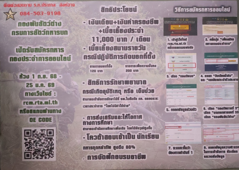 องค์การบริหารส่วนตำบลขุนคง ขอประชาสัมพันธ์จาก กองทัพบก เปิดรับสมัคร ทหารกองเกินเข้ารับราชการทหารกองประจำการ โดยวิธีร้องขอ (กรณีพิเศษ) ด้วยระบบออนไลน์ ประจำปี 2569