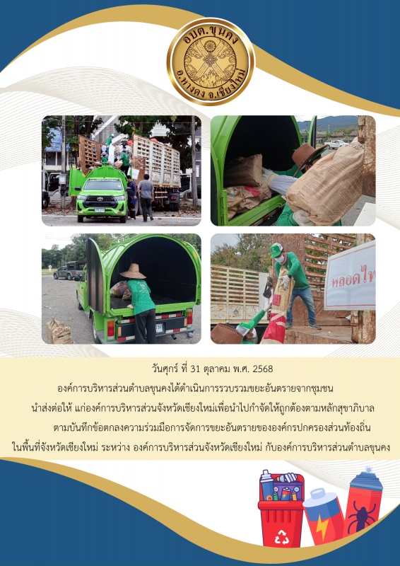 วันศุกร์ ที่ 31 ตุลาคม พ.ศ. 2568 องค์การบริหารส่วนตำบลขุนคงได้ดำเนินการรวบรวมขยะอันตรายจากชุมชน นำส่งต่อให้ แก่องค์การบริหารส่วนจังหวัดเชียงใหม่เพื่อนำไปกำจัดให้ถูกต้องตามหลักสุขาภิบาล ตามบันทึกข้อตกลงความร่วมมือการจัดการขยะอันตรายขององค์กรปกครองส่วนท้องถิ่น ในพื้นที่จังหวัดเชียงใหม่ ระหว่าง องค์การบริหารส่วนจังหวัดเชียงใหม่ กับองค์การบริหารส่วนตำบลขุนคง
