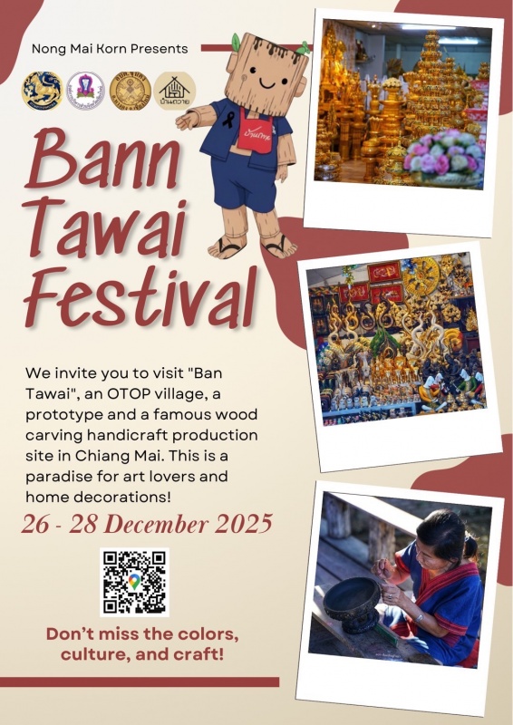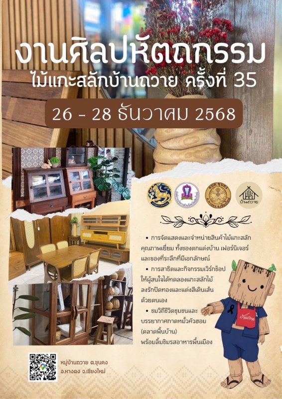องค์การบริหารส่วนตำบลขุนคง ขอประชาสัมพันธ์เชิญชวนเที่ยวงานศิลปหัตถกรรมไม้แกะสลักบ้านถวาย ครั้งที่ 35 ประจำปีงบประมาณ 2569 วันที่ 26-28 ธันวาคม 2568 ณ บ้านถวาย ตำบลขุนคง อำเภอหางดง จังหวัดเชียงใหม่