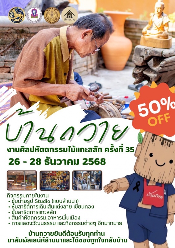 องค์การบริหารส่วนตำบลขุนคง ขอประชาสัมพันธ์เชิญชวนเที่ยวงานศิลปหัตถกรรมไม้แกะสลักบ้านถวาย ครั้งที่ 35 ประจำปีงบประมาณ 2569 วันที่ 26-28 ธันวาคม 2568 ณ บ้านถวาย ตำบลขุนคง อำเภอหางดง จังหวัดเชียงใหม่
