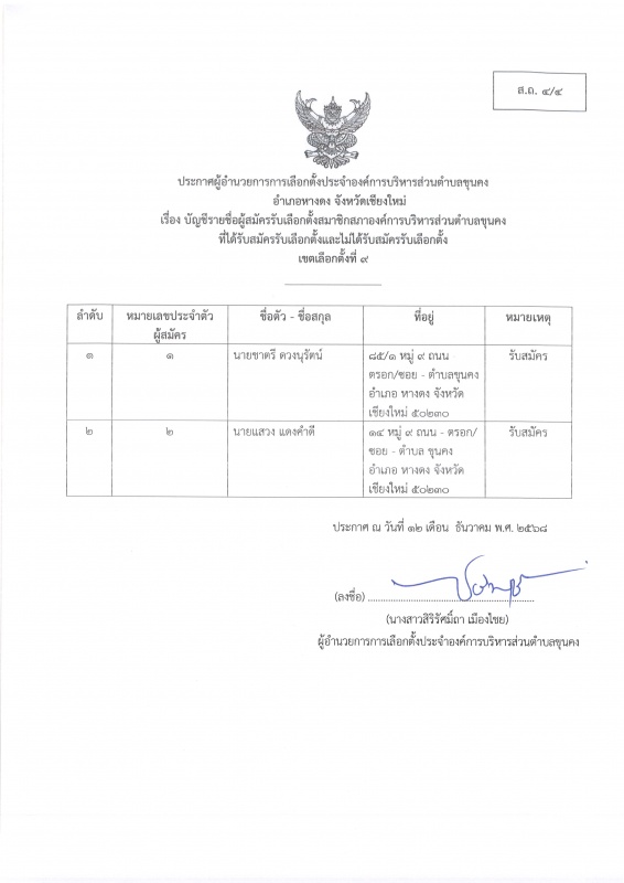 แจ้งประกาศผู้อำนวยการการเลือกตั้งประจำองค์การบริหารส่วนตำบลขุนคง เรื่อง บัญชีรายชื่อผู้สมัครรับเลือกตั้งนายกองค์การบริหารส่วนตำบลขุนคงที่ได้รับสมัครรับเลือกตั้งและไม่ได้รับสมัครรับเลือกตั้ง และ บัญชีรายชื่อผู้สมัครรับเลือกตั้งสมาชิกสภาองค์การบริหารส่วนตำบลขุนคงที่ได้รับสมัครรับเลือกตั้งและไม่ได้รับสมัครรับเลือกตั้ง เขตเลือกตั้งที่ 1 - เขตเลือกตั้งที่ 9